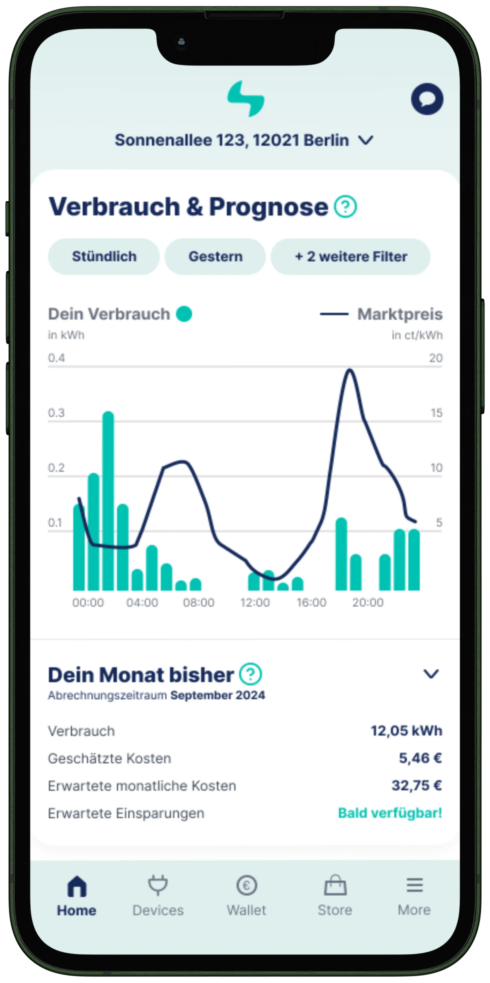 Unser Smart Meter und dynamischer Tarif sorgen dafür, dass du immer weißt, wie viel Energie du verbrauchst. Und mit unserer Smarten E-Auto-Ladung und mehr kannst du Energie dann nutzen, wenn sie am günstigsten ist — ganz ohne Aufwand.
